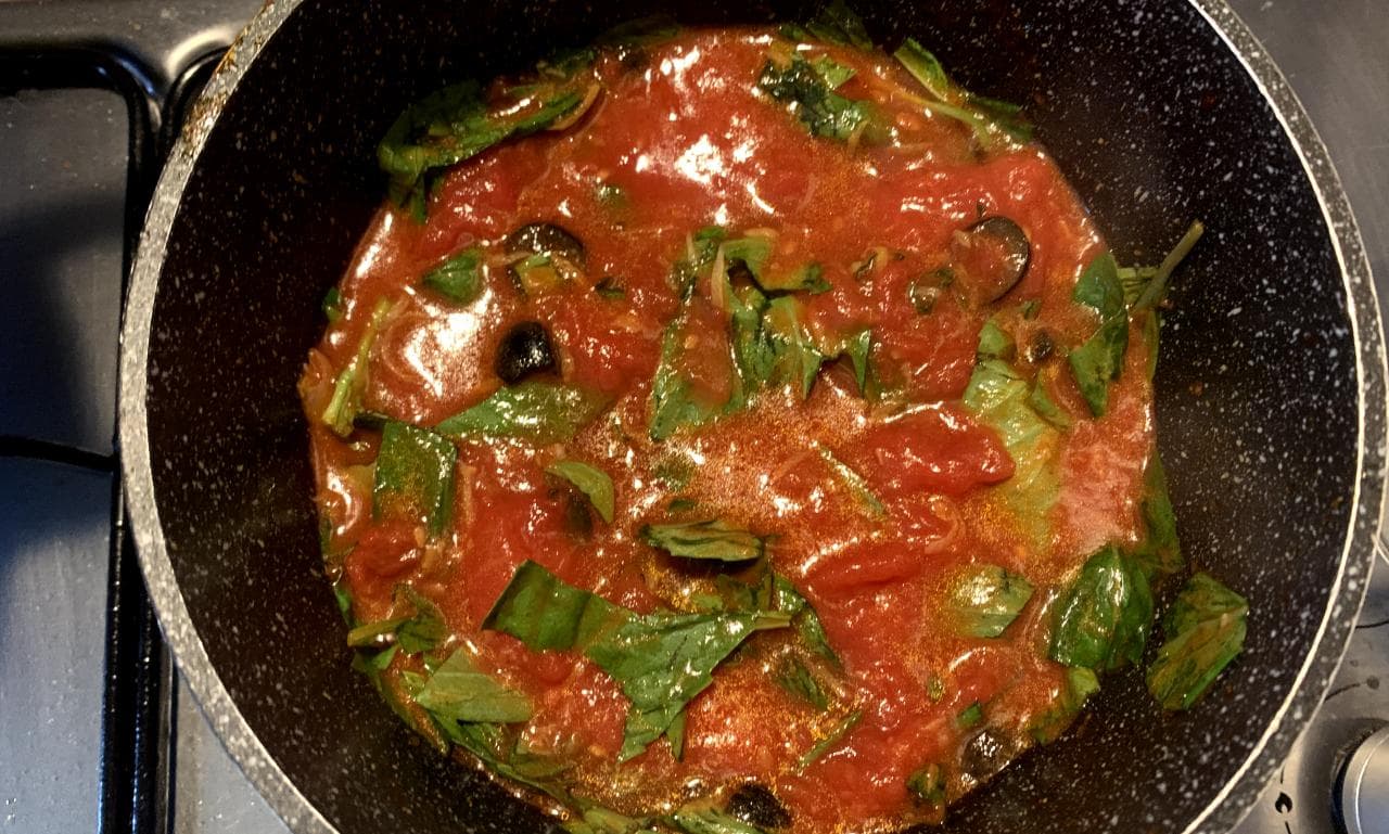 Wait for the tomatoes to reach a vigorous simmer while you slice the olives.