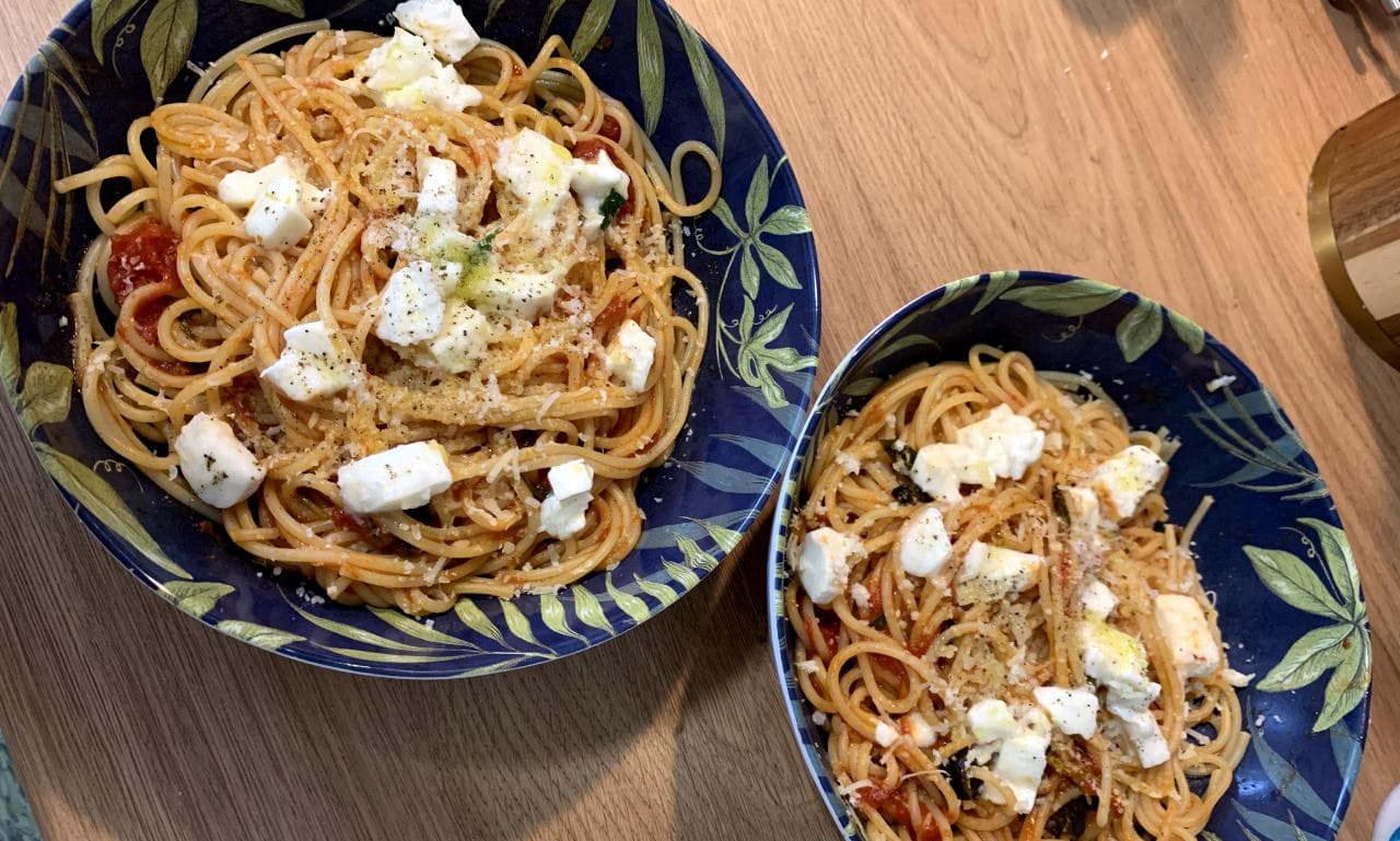 Once the pasta is evenly coated in the sauce, dish out and garnish with mozzarella, parmigiano, a drizzle of olive oil, and black pepper (in that order!).