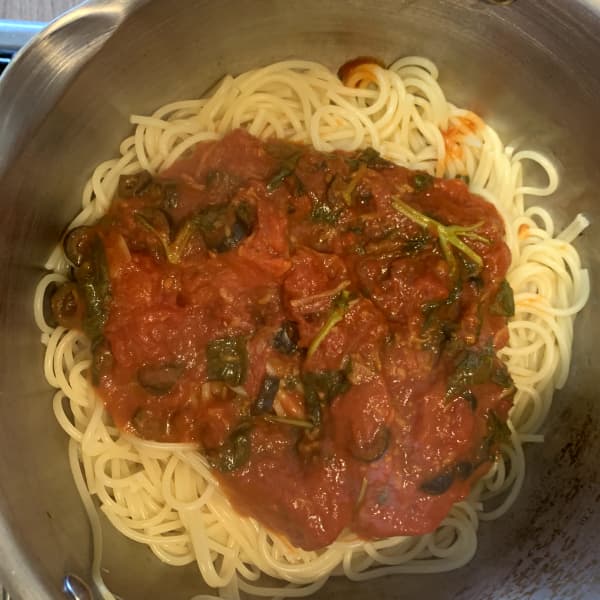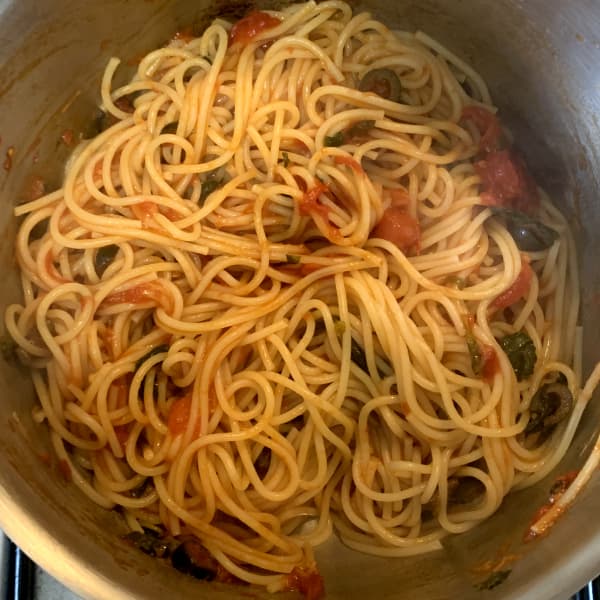 Salt the sauce to taste and add the pasta. (You may find that the sauce needs no salt at all, as the olives you've added are salty themselves.)