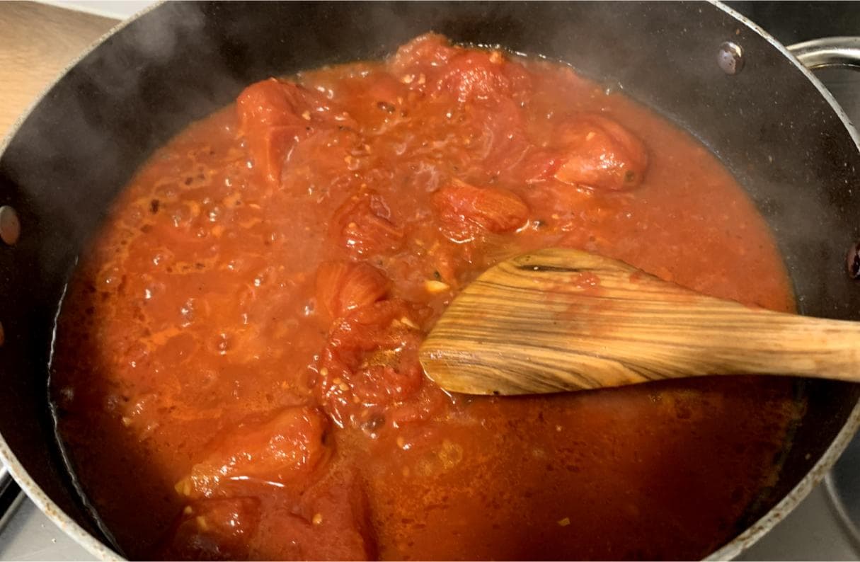 You can start to break up the plum tomatoes with a wooden spoon here, and they'll continue to fall apart nicely as they cook.