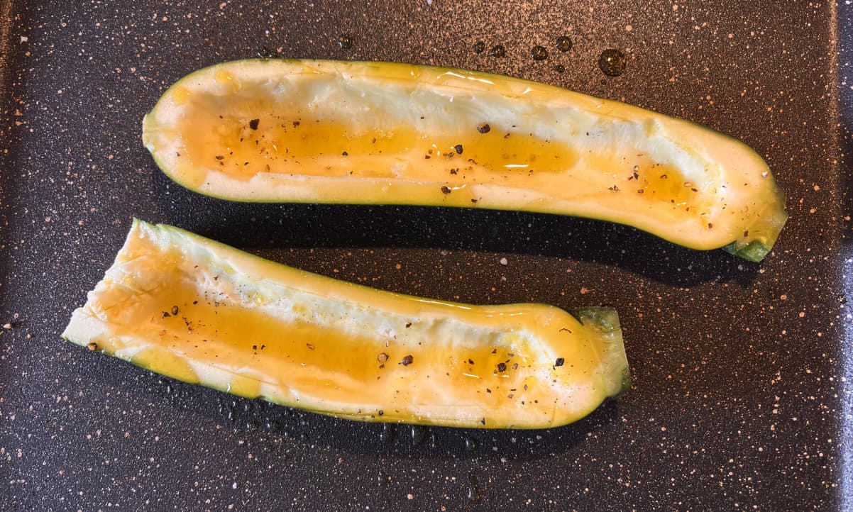 Season the boats you've made with olive oil, sea salt, and cracked black pepper. Then pop them in the oven and set a timer for 7 minutes.